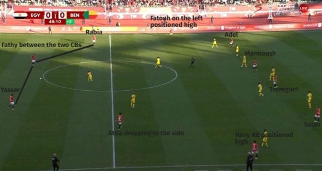 The second half opened with Egypt adopting a 5-4-1 out-of-possession shape, closing central lanes and forcing Benin wide.