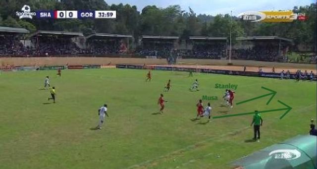They occasionally lured Gor forward through short circulation in the back line before releasing long diagonal passes into wide areas, targeting Michira on the left and Ezekiah Omuri on the right following further substitutions.