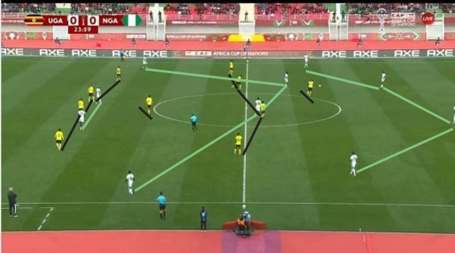 Nigeria targeted their left wing, leveraging Moses Simon's 1v1 technical ability to isolate defenders and access Uganda's attacking third.