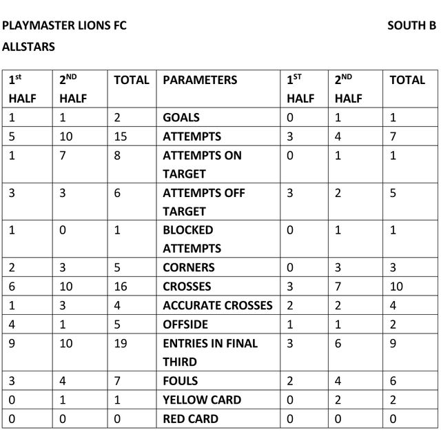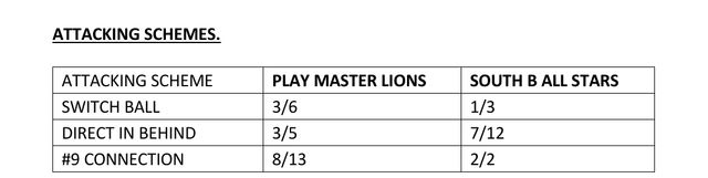 Play Master Lions had positional, quantitative and qualitative superiority. They would look to overload the South B All Stars last line of defense and look to move their block through switch balls.