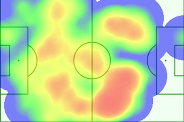 His heatmap below from this season’s matches, illustrates this: concentrated activity in the defensive and central thirds, with hotspots extending into attacking zones, reflecting his role in building from deep while venturing forward.