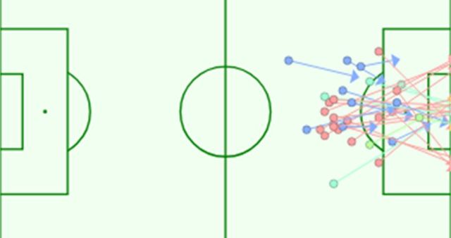 Alpha's shot map for last season too, reveals a propensity for ambitious attempts: 31 efforts, many from distance, with a mix of on-target (green), off-target (red), blocked (blue), and bar hits (gray), highlighting his willingness to strike from rest-defense positions in a 2,1 or 3,1 structures during set pieces.