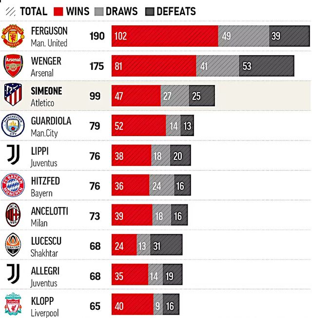 📊| Ferguson, Wenger and Simeone’s first 613 matches at Manchester United, Arsenal and Atlético de Madrid: