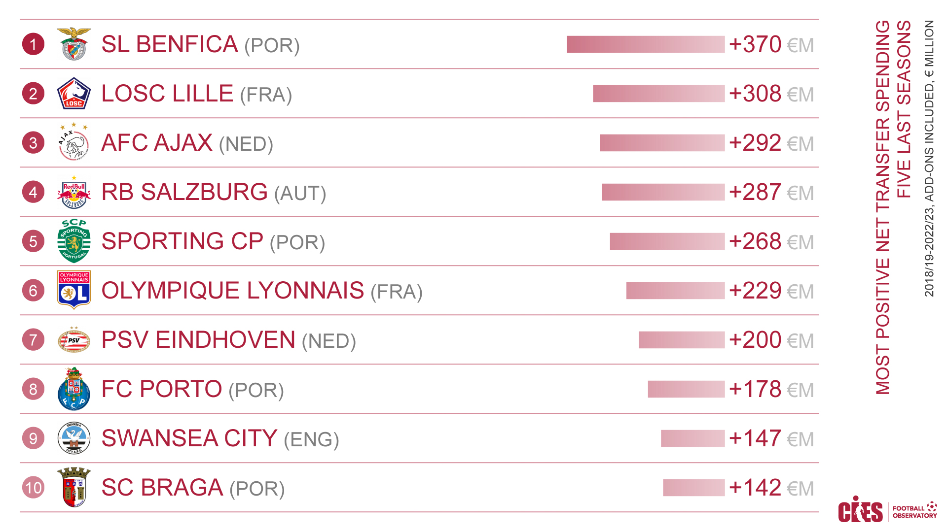 Some "usual suspects" follow. From Ajax (292,000,000), through Salzburg (287,000,000), Sporting (268,000,000) and Olympique Lyon (229,000,000) all the way to PSV Eindhoven (200,000,000) and Porto (178,000,000).