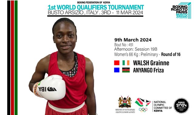 Kenya’s only active boxer in the 2024 Paris Olympics 1st World Qualification Tournament in Busto Arsizio, Italy, Frizah Anyango will have her work cut out Saturday evening when she lines up in her welterweight Round of 16 bout.