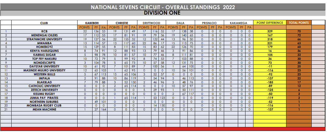 Teams will now shift their focus to the Prinsloo 7s that will be played in Nakuru this weekend before the season ending Kakamega 7s is played next weekend at the Bull Ring in Kakamega.