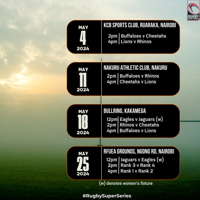 Scheduled to take place on four Saturdays in May 2024, with matches alternating between Nairobi, Nakuru, and Kakamega, the tournament will showcase four men’s and two women’s teams. Men’s teams, representing Kenya Cup Clubs, include Buffaloes, Cheetahs, Lions, and Rhinos, while Women’s teams will be part of the National Lionesses’ squad, competing as Eagles and Jaguars.